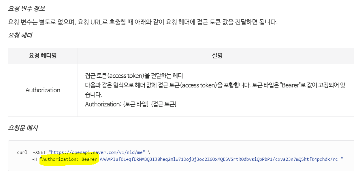 <네이버 develpoers 참고> 3.4.5 접근 토큰을 이용하여 프로필 API 호출하기