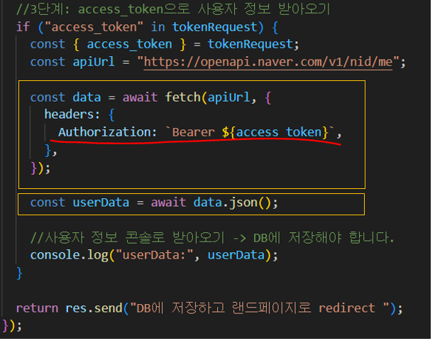 아래 코드를 추가해 준다. 네이버에 access_token을 주고 정보를 받아오는 단계이다.