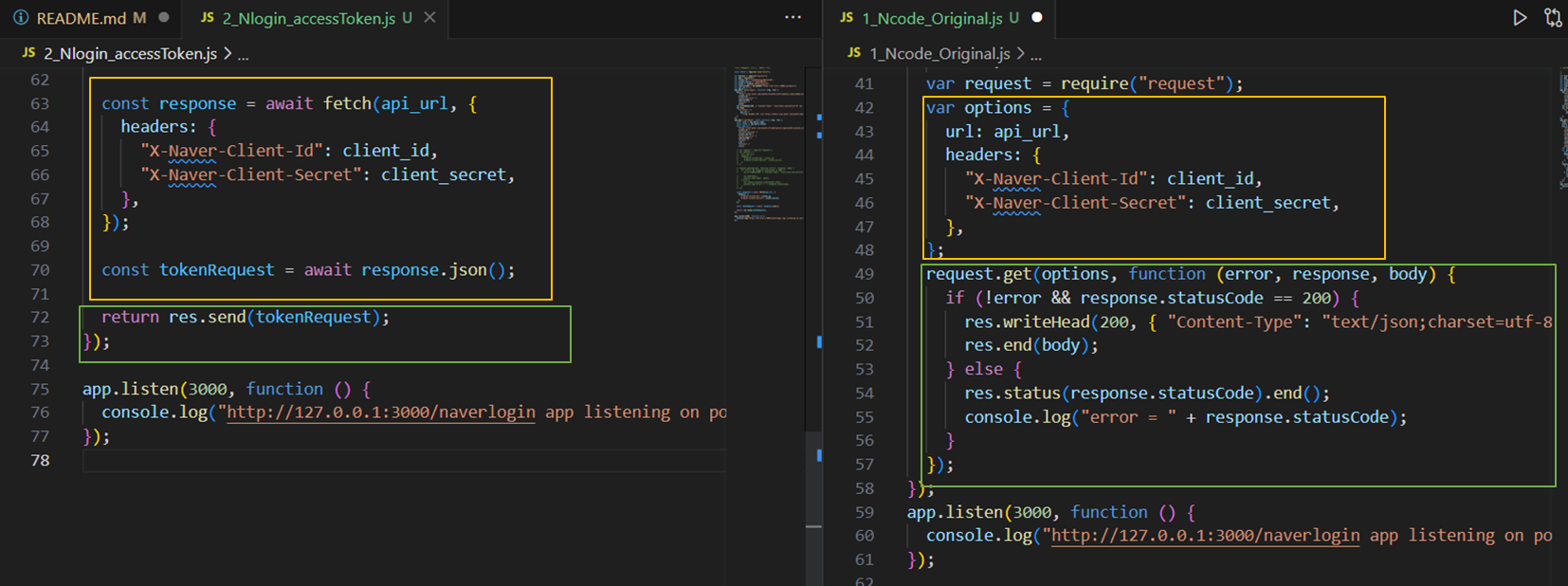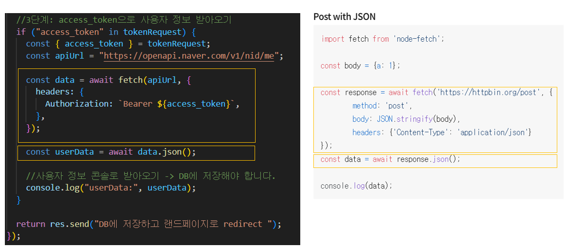 <왼쪽>node-fetch를 사용해서 코드 작성 <오른쪽> 원래 네이버에서 준 코드