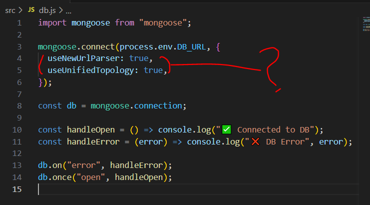 useNewUrlParser: 몽고디비에서 쓰는 parser를 이제 안쓰는데, (새로운 parser로 대체됨) 만약 새로운 파서에서 에러가 날 경우 예전에 쓰는 parser로 롤백 할수 있게 하기 위해서 라고 한다.