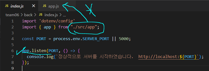 ① (핵심 기능모음인) app.js파일과의 연결 : 여기에 express나 여러가지 기능들이 다 이 곳에 들어 있다.