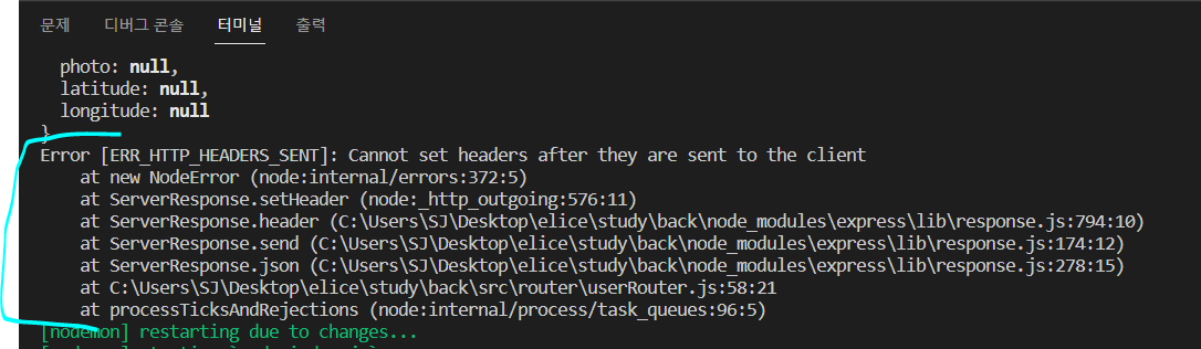 "headers는 이미 클라이언트 한테 보냈는데 또 보낼수 없다" 라고 말해주는 것.